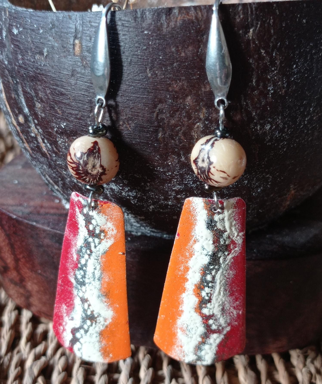 Emaux basse température sur métal de récupération, la perle est en ivoire végétal.
