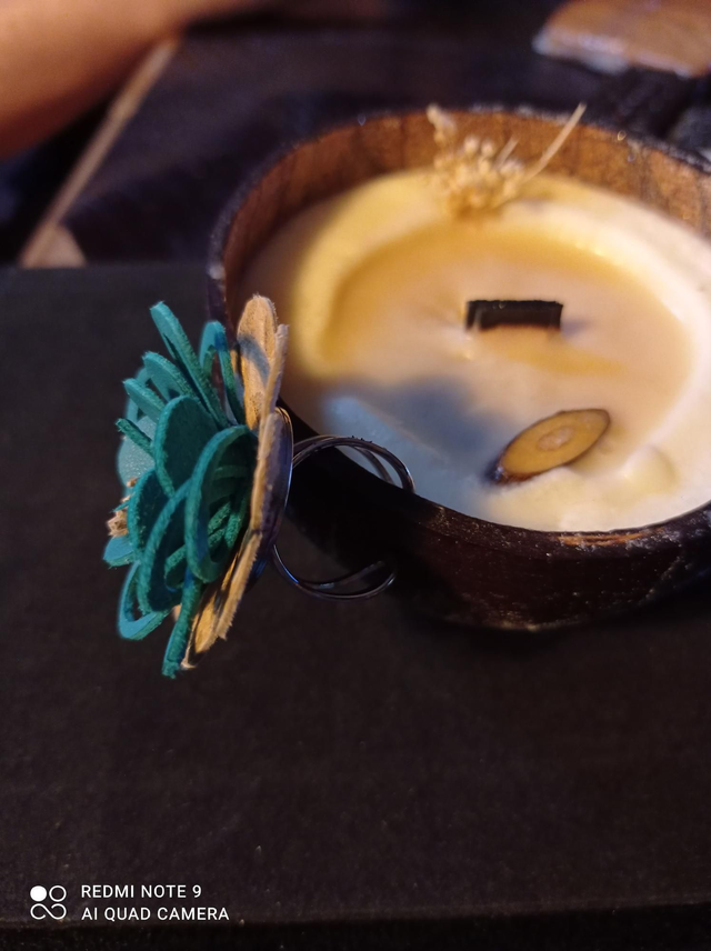 Bague réglable fleur munie de pétales de cuir beige et bleu. Montage sur acier inoxydable couleur argent diamètre 25mm.
